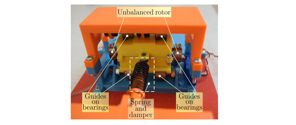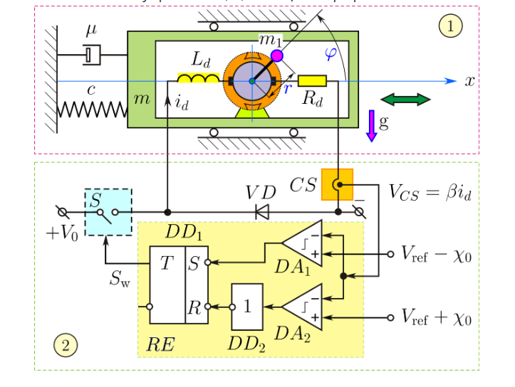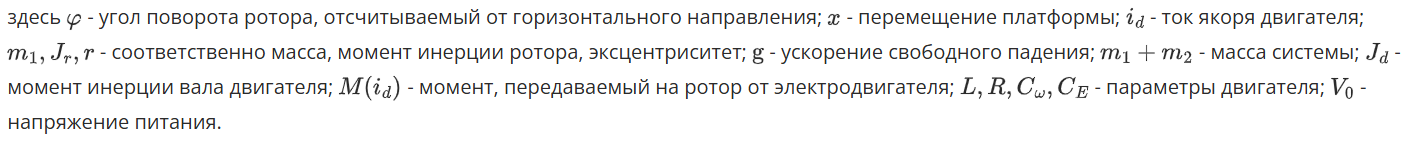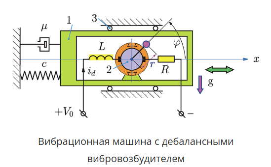 На платформе 1 массой , связанной с неподвижным основанием линейным упругим элементом жесткости (пружиной) и демпфирующим элементом с коэффициентом вязкого трения , установлен неуравновешенный ротор. Ротор приводится во вращение электродвигателем постоянного тока. Масса дебаланса сконцентрирована в точке, отстоящей от оси якоря электродвигателя 2 на расстояние . Горизонтальное движение платформы обеспечивается направляющими 3, например, на подшипниках качения. Уравнения движения этой системы имеют вид (Блехман И.И. Вибрационная механика. - М.: Физматлит, 1994.):